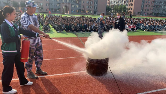 演练最后,教官给同学们上了一场干粉式灭火器使用方法的小课堂,具体讲解了面对突发性起火的应对措施以及灭火器的使用方法,并让同学们亲身体验了灭火器的使用。