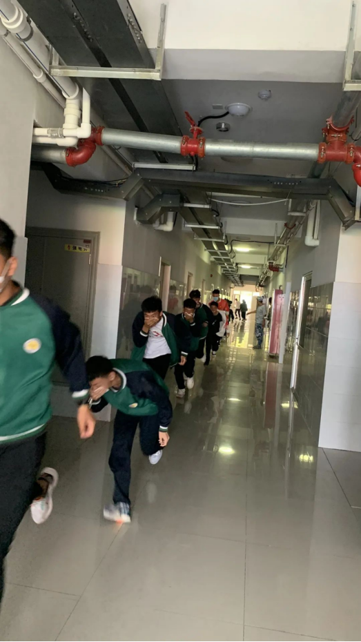 14点30分,消防演练正式开始,教师、教官以及工作人员提前到达各自岗位,引导学生快速有序撤离。按照计划公寓楼A座、B座、C座、E座学生依次展开演练。首先开始的是防地震演练,警报声响起,学生快速躲到桌子下、墙角等地方;第二次警报声响起,防火演练正式开始,每位学生沿着指定路线快速前进,有序地离开宿舍,紧急撤离到安全地带。整个演练过程,学生积极发挥主观能动性,做到了安全、快速、有序地完成了消防演练,达到了预期效果。