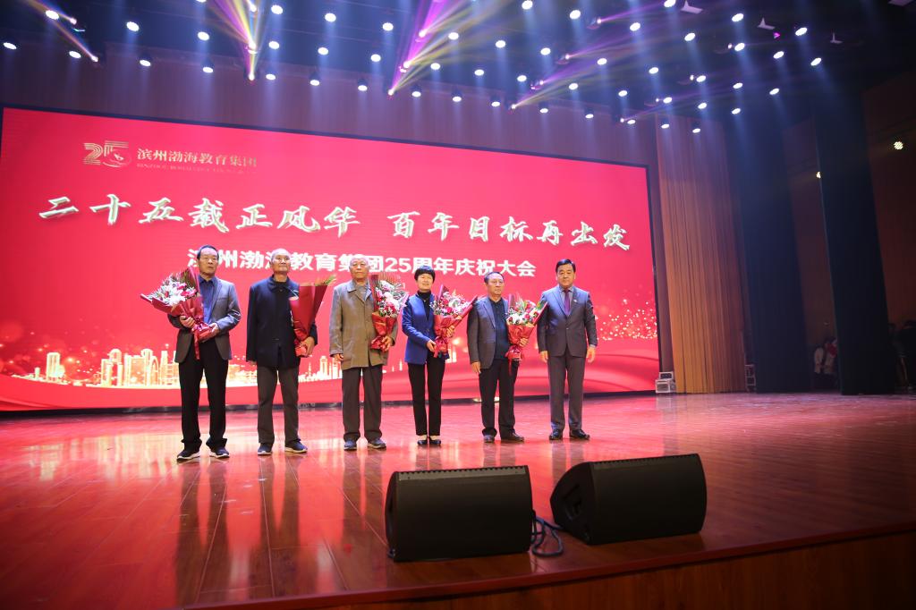 庆典大会邀请到渤海教育集团首任董事长刘相国、原滨州职业教育学校校长周茂温,渤海中学首任校长张忠华,渤海职业技术学校原校长李德林,渤海金色摇篮幼儿园首任园长刘秀娥五位老领导,集团创始人刘相生亲自向老领导献花,感谢他们在那个时期的辛苦耕耘和为集团的付出。