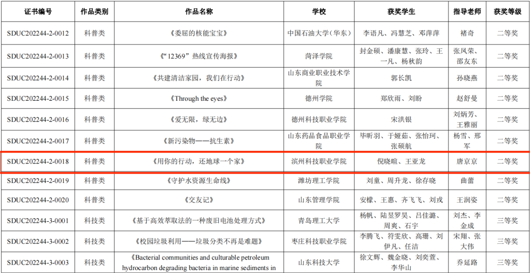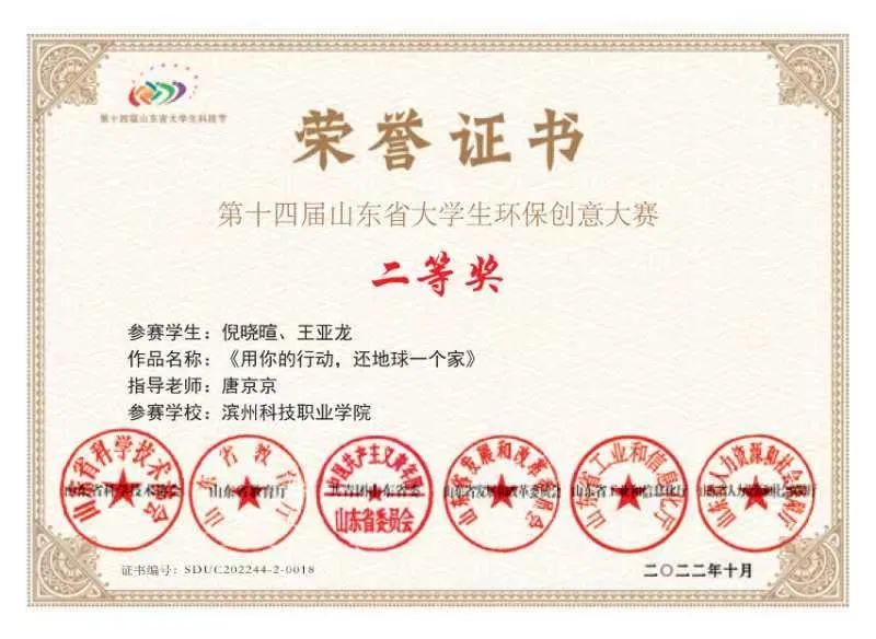 beat365唐京京老师指导,学生倪晓暄、王亚龙完成的作品《用你的行动,还地球一个家》在第十四届山东省大学生科技节—“蓝盾杯”山东省大学生环保创意大赛获得二等奖。
