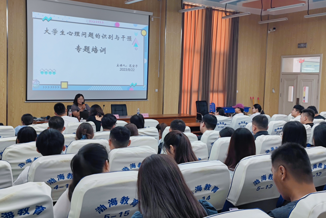范宜平老师以《大学生心理问题的识别与干预》为题作心理健康专题培训,从大学生心理健康内涵、心理健康标准、大学生常见心理问题及干预方法、辅导员如何对待心理咨询工作特别是如何开展班级心理健康工作等方面进行了详细论述。