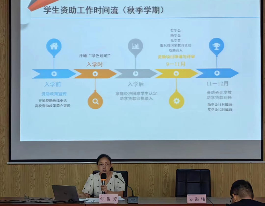 韩俊芳老师对高等学校国家资助政策进行了解读,详细介绍了即将开始的家庭经济困难学生认定工作,对奖助学金、生源地信用助学贷款、绿色通道、勤工助学、应征入伍服兵役学生国家教育资助等政策作出相应介绍。