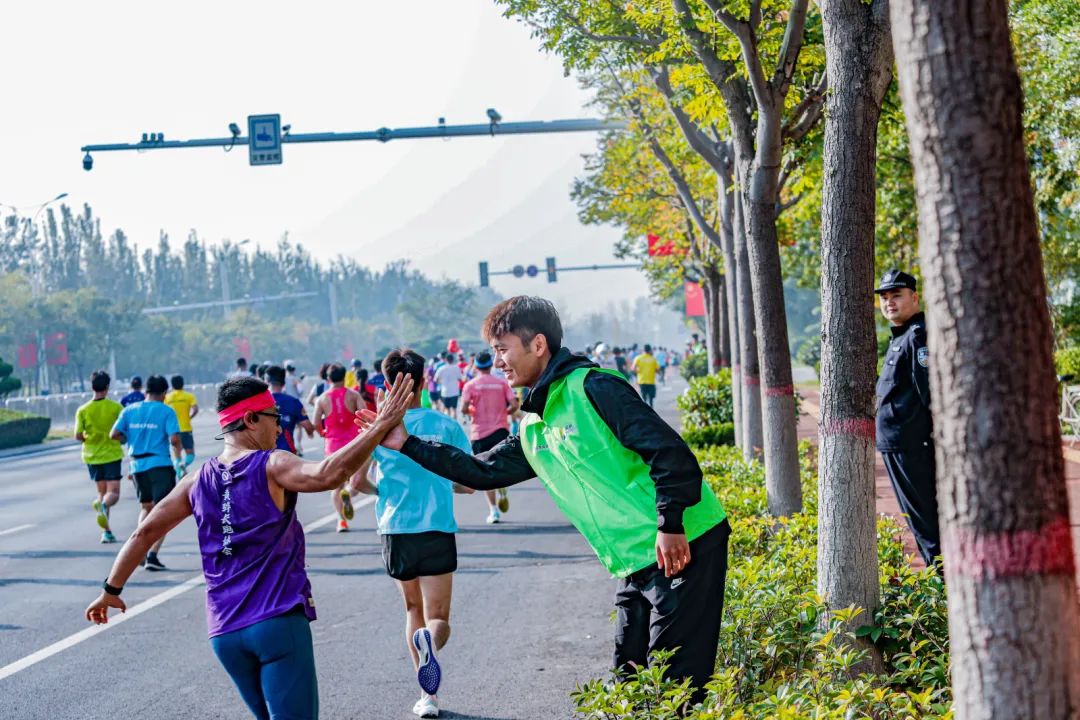 赛场上,每一名青年志愿者都以充沛饱满的热情,坚守在自己的岗位上,闪耀在赛道的每个角落,观察赛道情况,随时汇报,为参赛选手进行补给提供、赛道引导、终点搀扶、等细心周到的服务,用最饱满的热情为参赛选手加油打气。