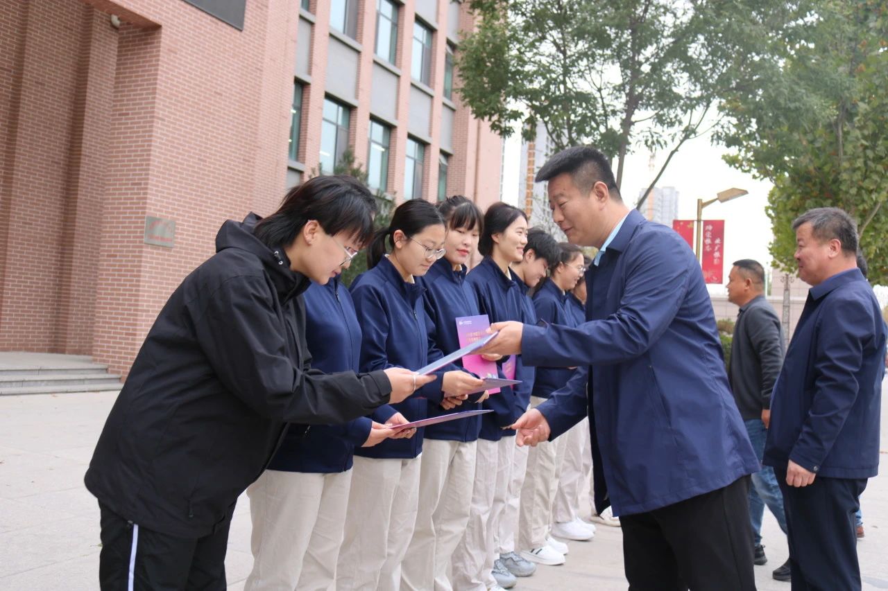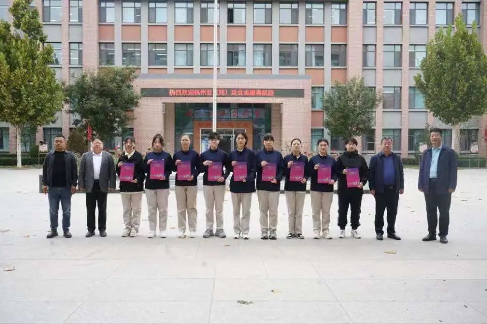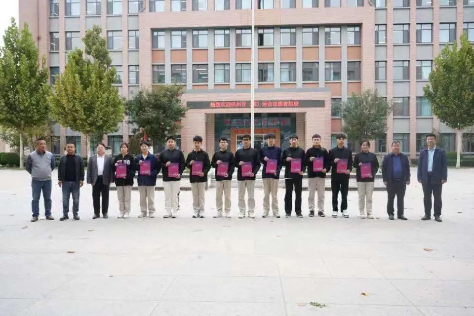 在欢迎杭州亚(残)运会志愿者凯旋仪式上,学校领导为志愿者颁发证书并合影留念。