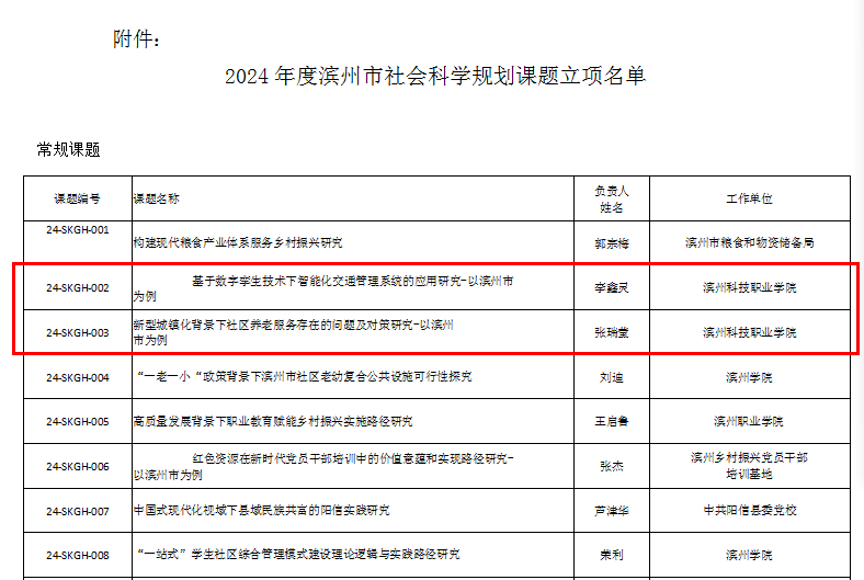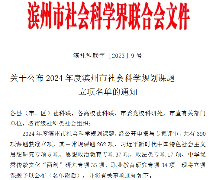 近日,滨州市社科联印发了《关于公布2024年度滨州市社会科学规划课题立项名单的通知》,beat365在线唯一官网9项课题获得立项,取得开门红。