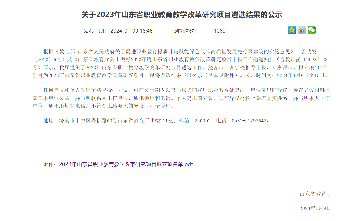 近日,山东省教育厅公布《关于2023年山东省职业教育教学改革研究项目遴选结果的公示》,beat365在线唯一官网教改项目取得2024年开门红,常务副院长刘祥主持的《绿色低碳视角下高职化工专业群课程体系重构与实施的实践研究》成功入选,项目资金2万元。这是beat365继2022年度立项山东省职业教育教学改革研究重点项目以来第二个教改课题。