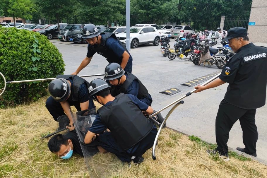 演练现场模拟了一名男子因仇视社会,谎称学生家长,欲闯入校园绑架学生报复社会。该“歹徒”试图进入学校,因其身份无法核实被校门安保人员拒绝放行,“歹徒”便拿出事先藏匿好的攻击性武器强行闯入校园。对此,值班安保人员迅速拿出钢叉、警用盾牌及橡胶棍与歹徒进行搏斗,其中一名安保人员按下一键报警装置向公安机关报案并上报安全与后勤处值班干部。值班干部立即上报学校值班领导,学校迅速全面启动应急工作程序:110校园巡逻队前往现场紧急增援;广播组拉响警报,通报至各个班级要求全校师生紧闭门窗、紧急安全避险;其它各应急小组人员在最短的时间内到位,按照分工与职责,共同处置突发事件。在与“歹徒”进行了激烈的追逐搏斗之后,安保人员、110校园巡逻队将“歹徒”成功制服,派出所民警到达现场对男子进行控制抓捕后带离。