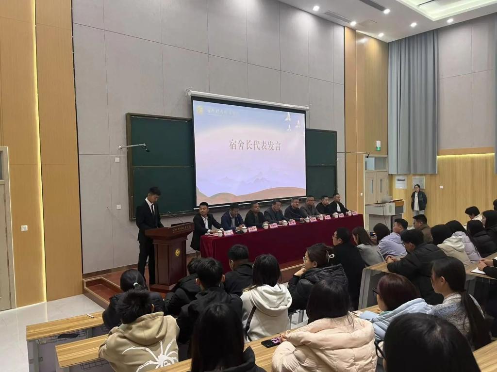 信息技术学院宿舍代表长朱岳发言,表示要时常向内反省自我责任,向外观察宿舍整体表现,结合宿舍内实际情况,号召同学们要遵守学生公寓管理规范,维护好宿舍内关系,积极调动同学参加活动,共创和谐、温馨的宿舍环境。
