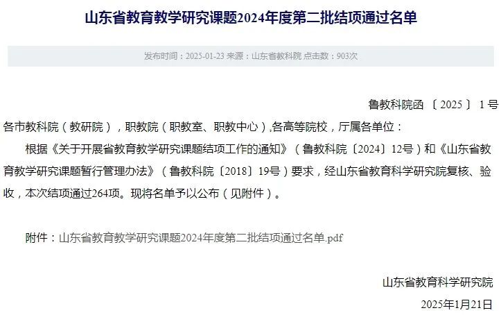 近日,山东省教育科学研究院公示了2024年度山东省教育教学研究课题第二批结项通过名单,beat365主持的一项课题顺利结项。教育科研是教育教学的活力之源,是教师专业成长的必由之路,一直以来beat365高度重视教科研工作,积极组织各级各类课题的申报工作,发挥课题研究的引领作用,通过课题申报丰富学校内涵成果。