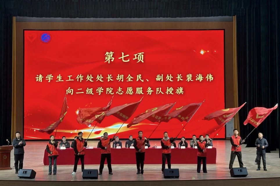 学生工作处处长胡全民、副处长裴海伟向二级学院志愿服务队授旗。