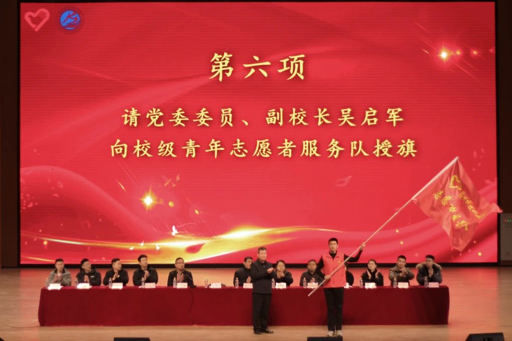 党委委员、副校长吴启军向校级青年志愿者服务队授旗。
