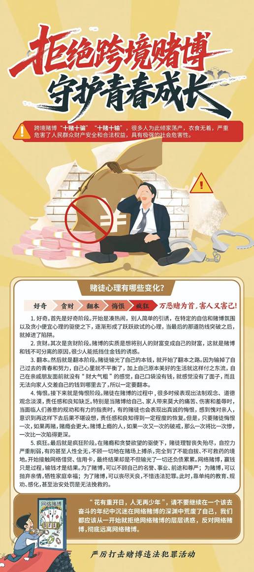 4.增强法律意识:告知孩子参与跨境赌博、为赌博平台提供技术支持或推广引流等行为均属违法,切勿因一时侥幸触碰法律红线。