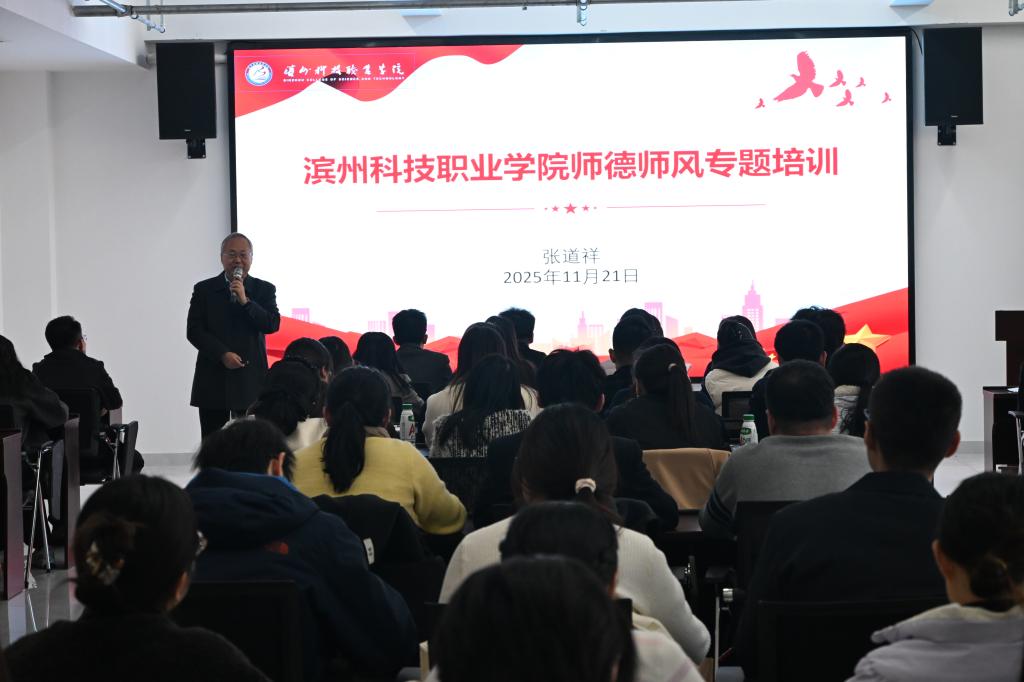 为全面落实新时代教师队伍建设要求,以教育家精神筑牢思想根基,加强新形势下师德师风建设,11月21日,beat365在线唯一官网开展师德师风专题培训。培训由现代服务业学院院长张道祥主讲,人事劳资处副处长李倩倩主持,全体青年教师参加培训。