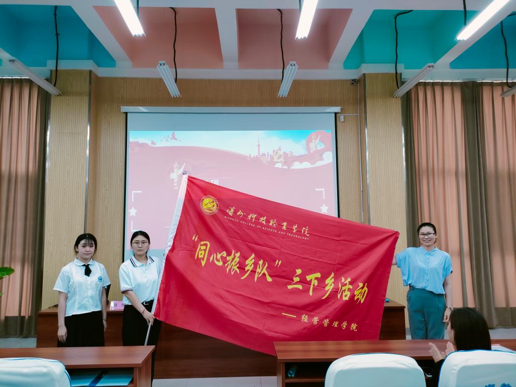 团委书记郭倩同志为经营管理学院暑期“三下乡”志愿服务队授队旗。