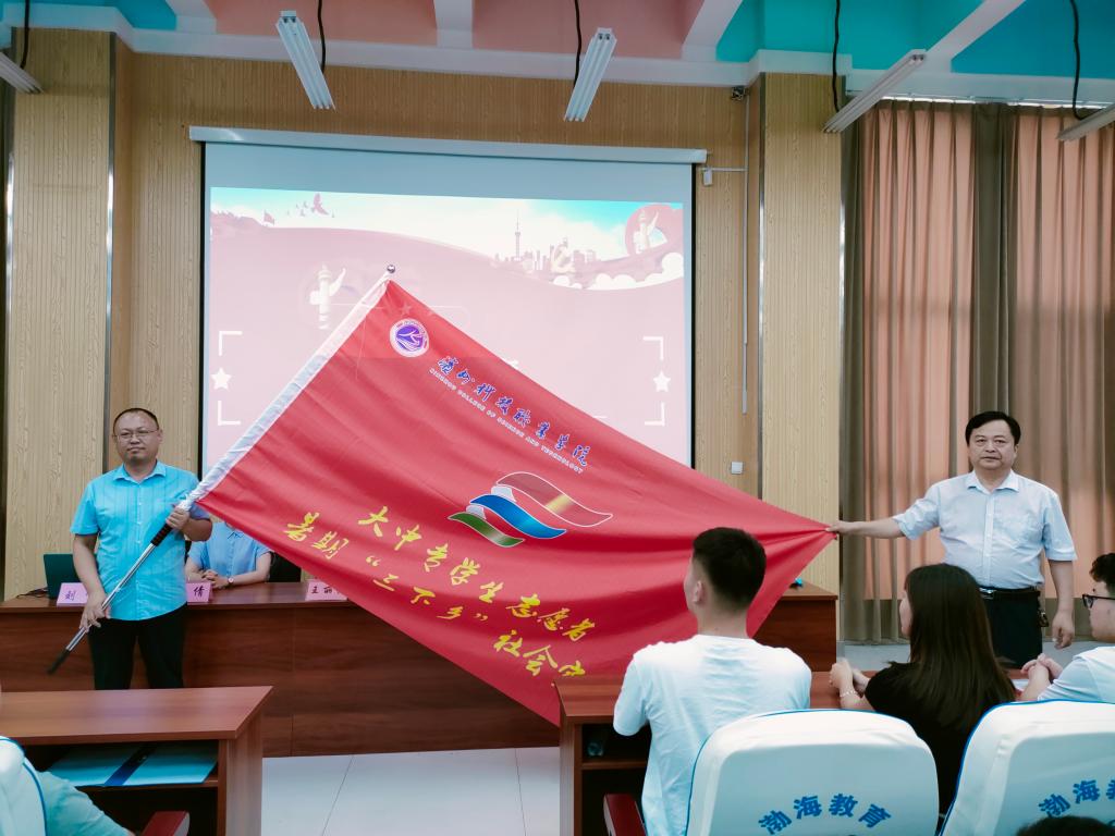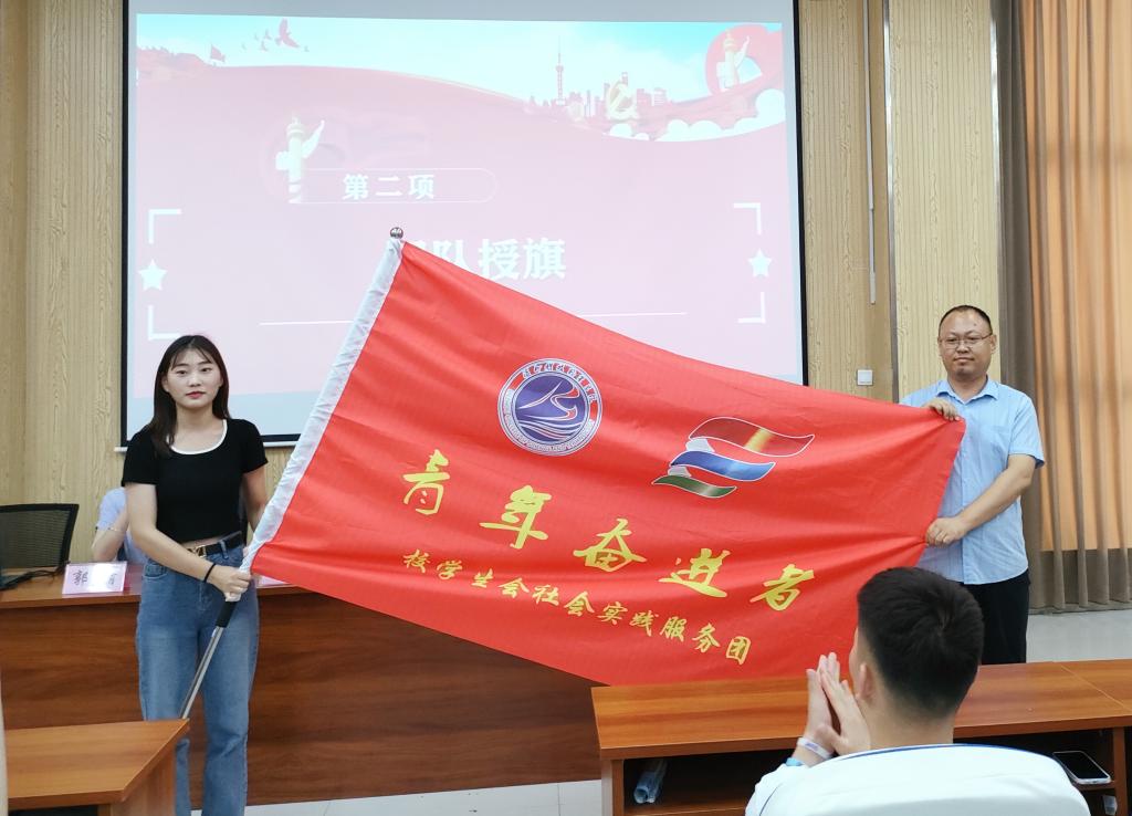 学生工作处学生管理负责人刘宁同志为由校学生会暑期“三下乡”志愿服务队授队旗。