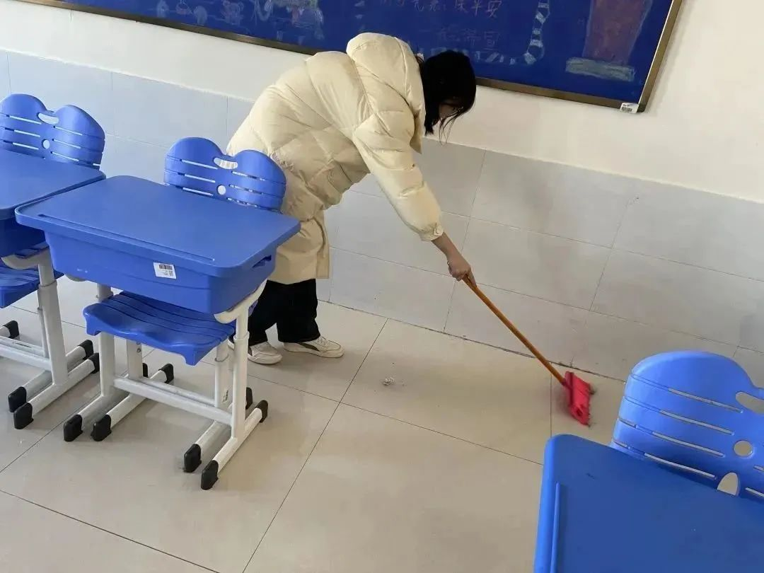 老师们和回校的同学们分工合作,有的负责拖地,有的负责扫地。把各班卫生打扫干净的同时,也潜移默化的营造了劳动光荣等精神。