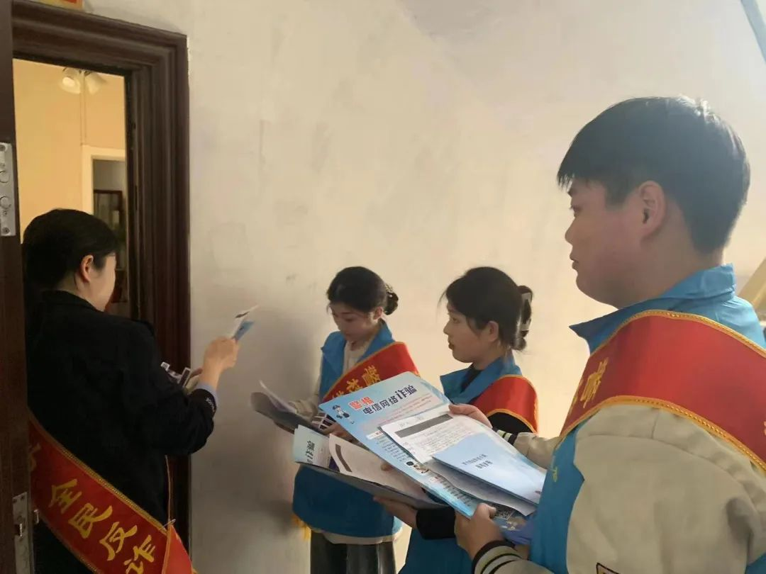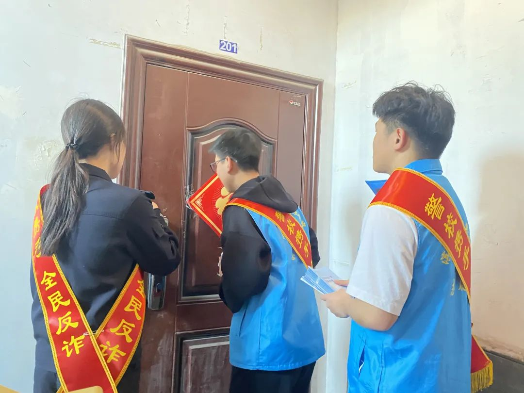 返回社区后,各位警官及志愿者稍作休整便开始挨家挨户上门为居民进行防诈知识讲解。