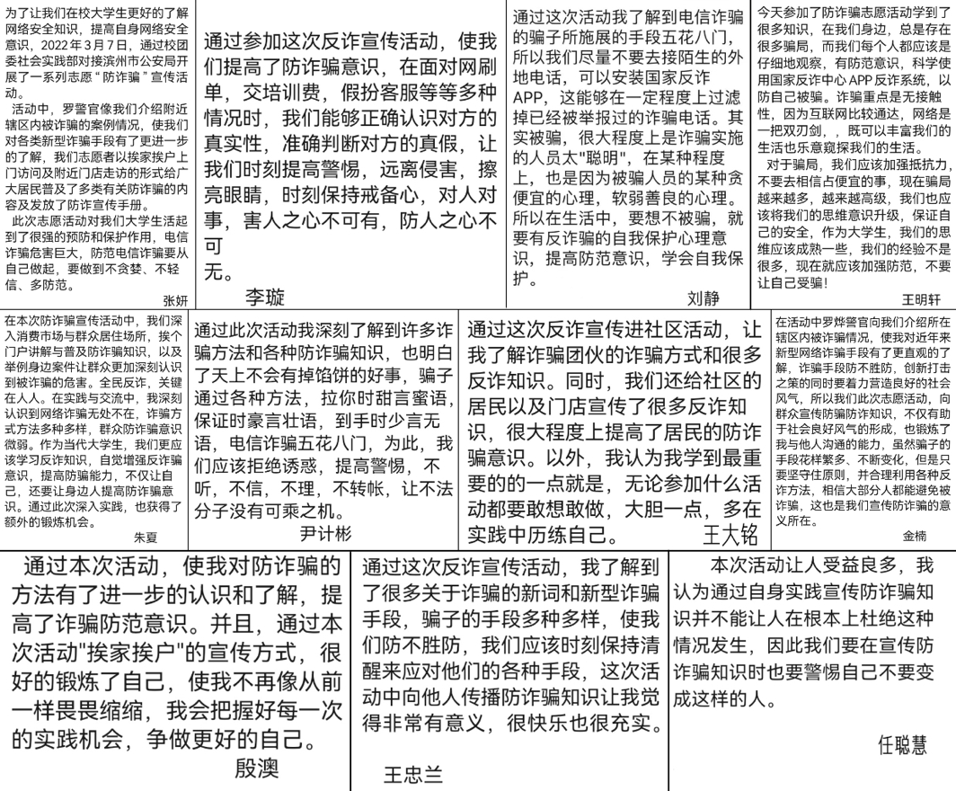 在第60个“学雷锋纪念日”到来之际,校团委社会实践部在滨州市公安局带领下,于2023年3月7日下午在明日星城周边开展了反诈宣传进社区志愿服务活动,向居民及周围商户发放传单,宣传反诈骗知识,提高居民的防范意识。