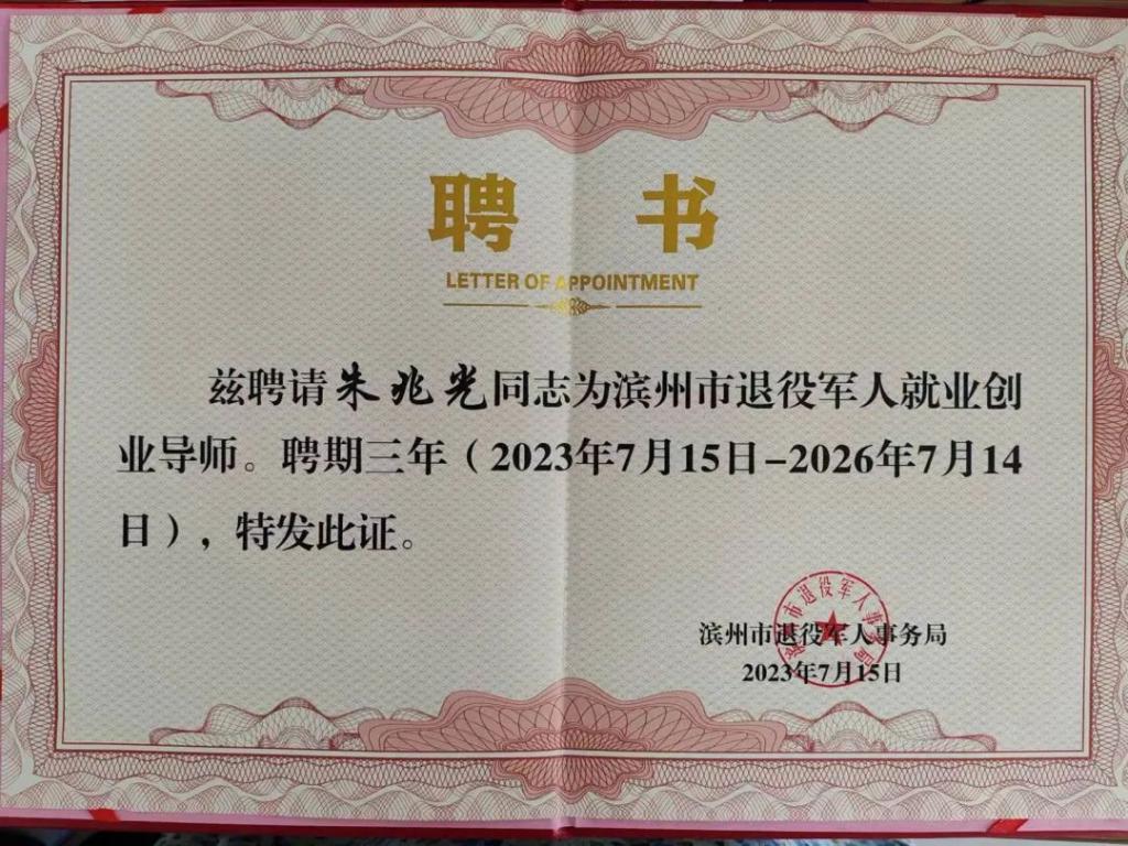 近日,beat365开放教育学院教师朱兆光被滨州市退役军人事务局聘为全市退役军人就业创业导师,退役军人培训工作再添新实践。