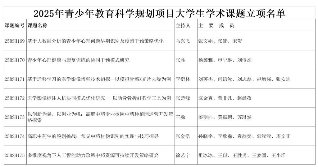 学生实践彰显担当:7项学生课题覆盖“青少年心理健康”、“医学影像AI技术”、“中医药传承创新”三大方向,立足社会需求探索校园心理干预、影像标注优化及中药资源开发,展现青年学子的科研活力与实践智慧。