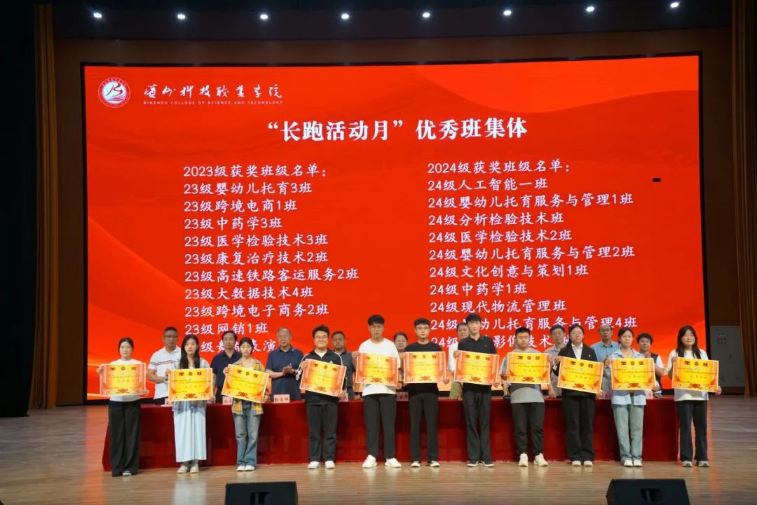 65名同学在有效跑步次数、距离上表现突出,被授予“优秀个人”称号,2024级婴幼儿托育服务与管理1班、2024级人工智能技术应用1班等20个班集体在阳光长跑中积极参与,被授予“优秀班集体”称号;17位辅导员在日常跑步过程中时刻鼓励学生,以身作则,被授予“优秀辅导员”称号;6位体育教师积极指导学生、规范跑步姿势,被授予“优秀指导教师”称号。