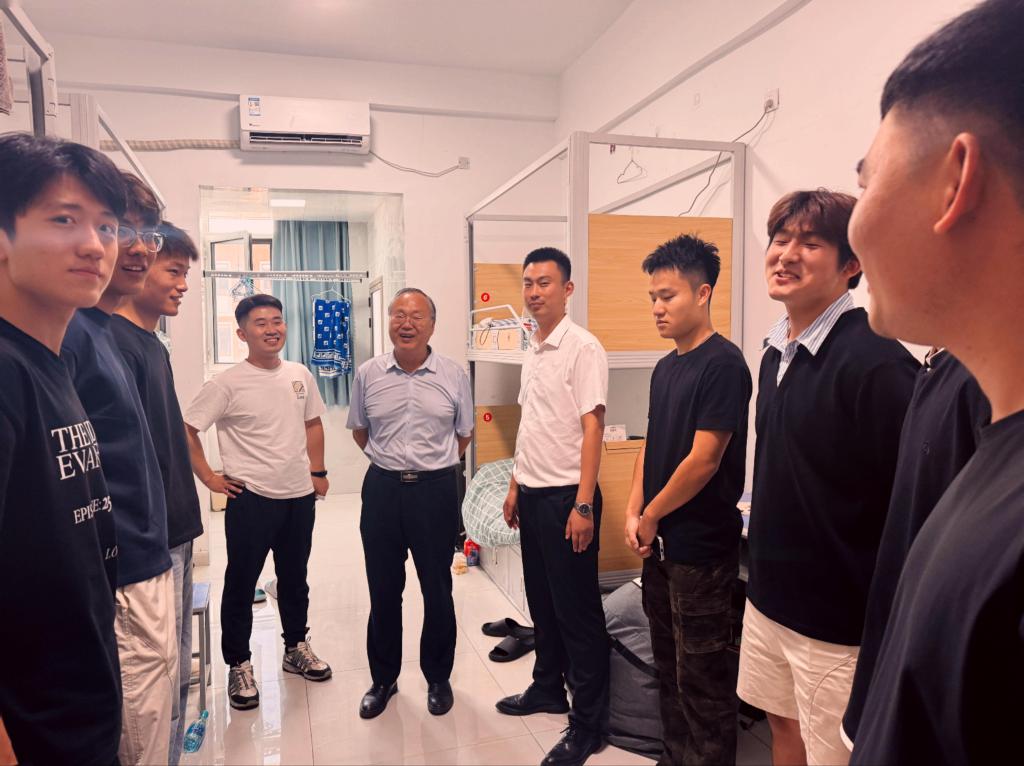 校领导来到迎新现场,亲切慰问迎新一线的师生,并与新生及家长热情交流,现场氛围热烈;学院领导带队深入新生宿舍开展安全专项检查,重点排查消防器材、电气线路等关键设施,现场建立隐患台账、明确整改时限;与新生面对面交流,密切关注学生的生活需求,用平实话语提醒其防盗防骗、注意用电规范,帮助其尽快适应集体生活。