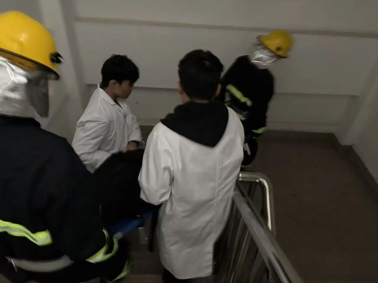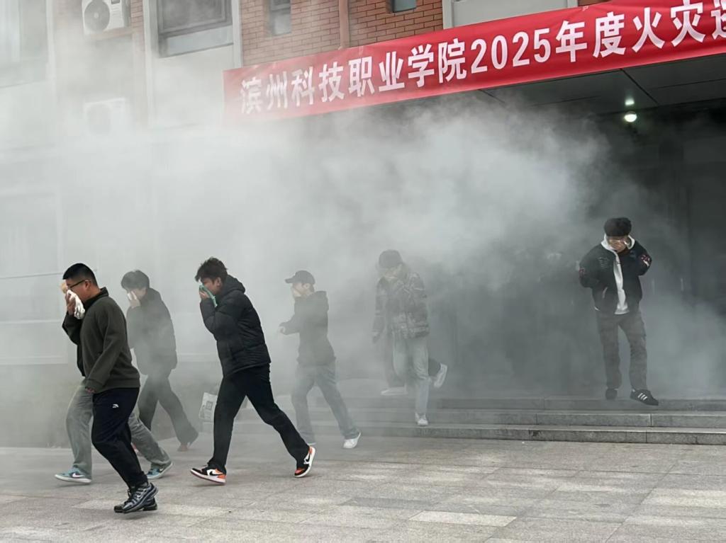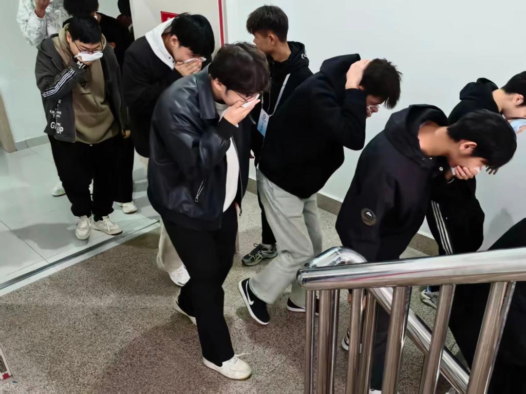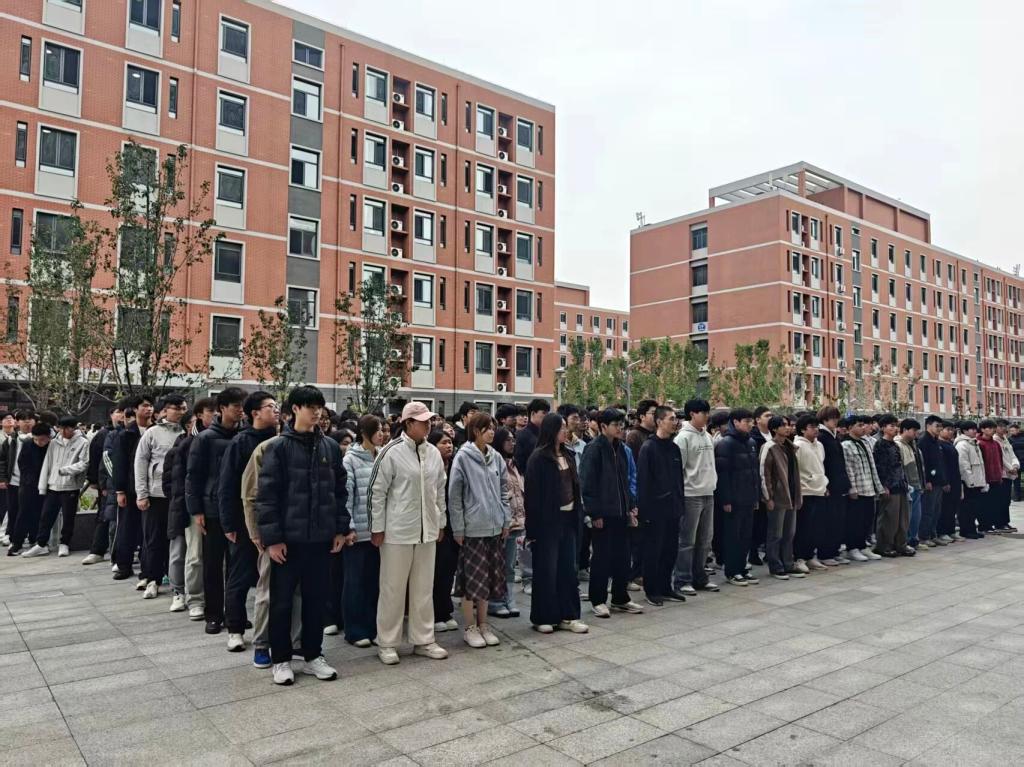 演练的主要内容为模拟11号楼3层某宿舍因电器使用不当引发“火情”并产生大量烟雾的场景。11号学生公寓310室浓烟燃起,触发宿舍内的烟雾报警装置,消防控制室值班员立即通知公寓宿管员,宿管员到达现场查看实况后,第一时间向消防控制室反馈“火情”,消防控制室人员立即拨打119报警电话,同时报告上级领导,立即启动应急预案,并启动消防广播,提醒同学们有序撤离。各楼层疏散引导员闻令而动、迅速就位,指挥学生使用湿毛巾严密捂住口鼻,保持弯腰低姿的安全姿态,沿走廊东西两侧楼梯的预定疏散路线,分批次、快而不乱地有序撤离。整个疏散过程中,引导员全程精准疏导、实时提醒,学生们听从指挥、步伐整齐,无拥挤、无喧哗,充分展现了两个学院应急处置的高效组织能力及良好的应急素养。
