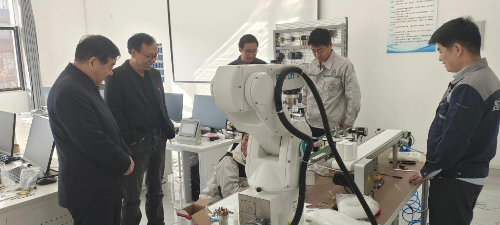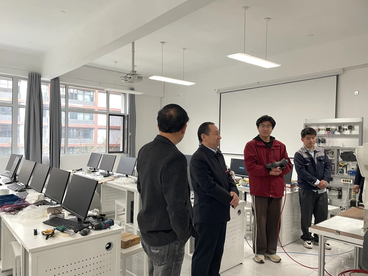 在实训室现场,参赛学生们正围绕自主设计搭建的模拟医药企业灌装生产线忙碌着,从电气控制系统调试到工业机器人精准操作,从机电一体化设备组装到产线流程优化,每一个环节都有条不紊、精益求精。刘相生与孙才顺认真聆听学生关于项目设计理念的汇报,详细询问技术难点攻克情况,并不时与指导教师交流备赛进度与训练方案。