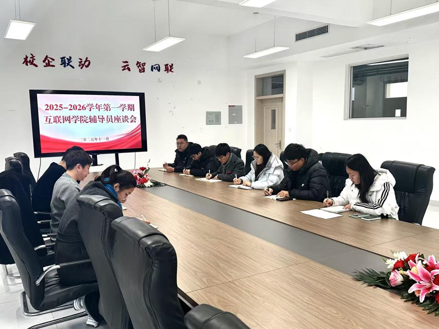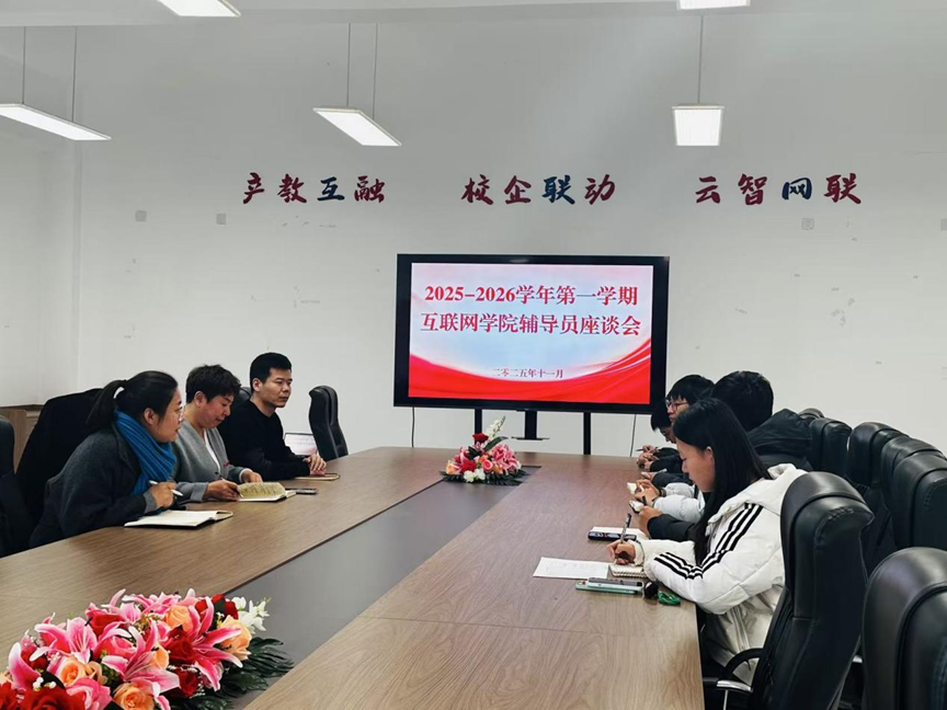为进一步强化学生思想政治教育与日常管理工作,提升辅导员队伍育人能力,近日,互联网学院在互联网学院B412会议室召开2025-2026学年第一学期辅导员座谈会。院长沈燕宁、副院长张瑞恒、学管科科长孙琦瑕以及全体辅导员参加会议。