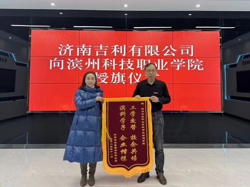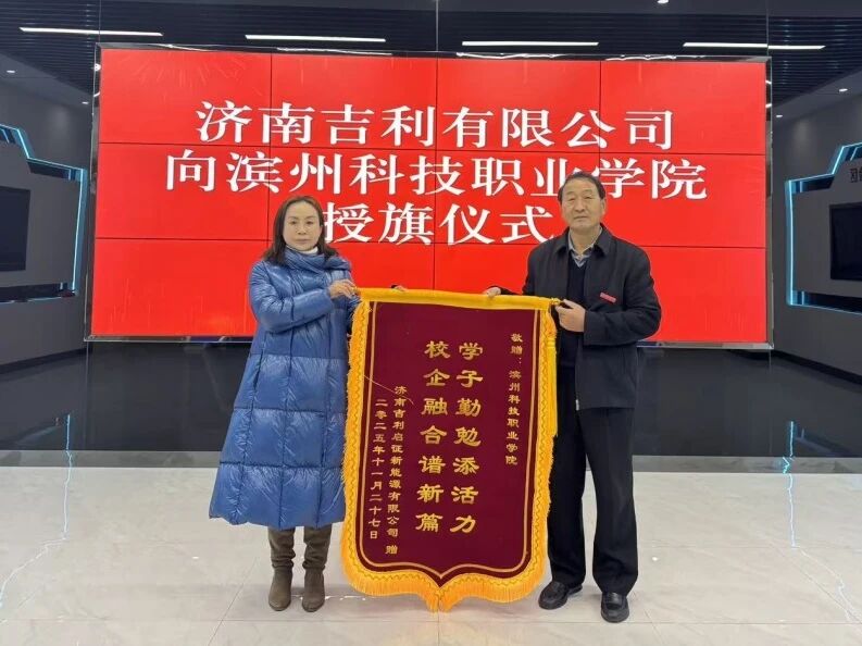 近日,济南吉利启征新能源有限公司向beat365在线唯一官网进行授旗。济南吉利启征新能源有限公司负责人、智能制造学院院长李秀龙、实习就业中心主任李守峰共同出席仪式,见证双方深化产教融合、共育技术人才的重要时刻。