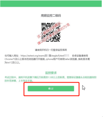(5)鹰眼监控开启且按照要求架设后,在考试设备的界面上点击“确定”按钮(如下图所示)进行考试。