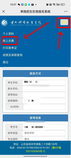 2.进入考生账号登录页面,输入考生号和密码(身份证号后6位)登录查看个人信息——点击右上角菜单键——点击网上交费。