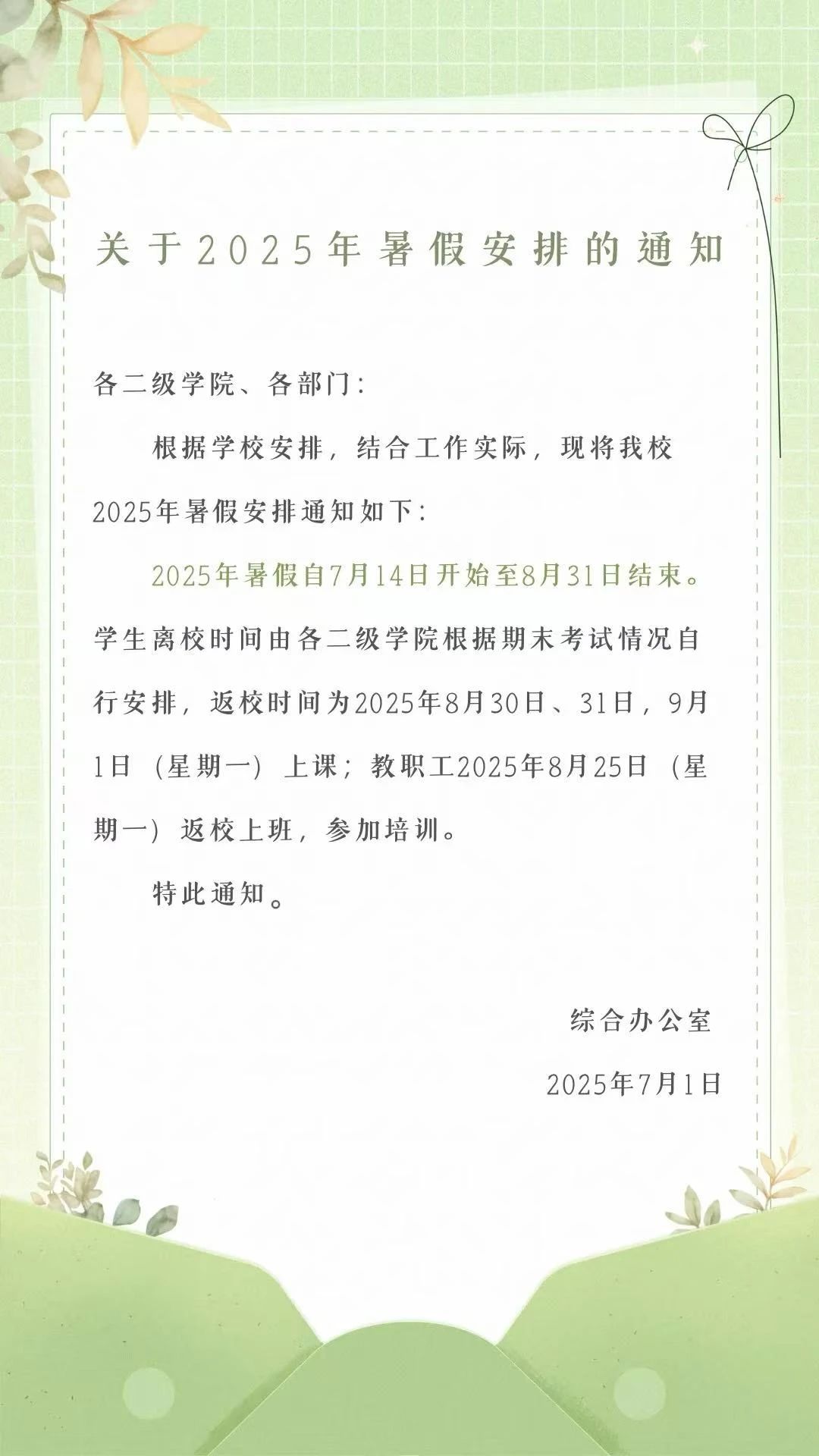 关于2025年暑假安排的通知