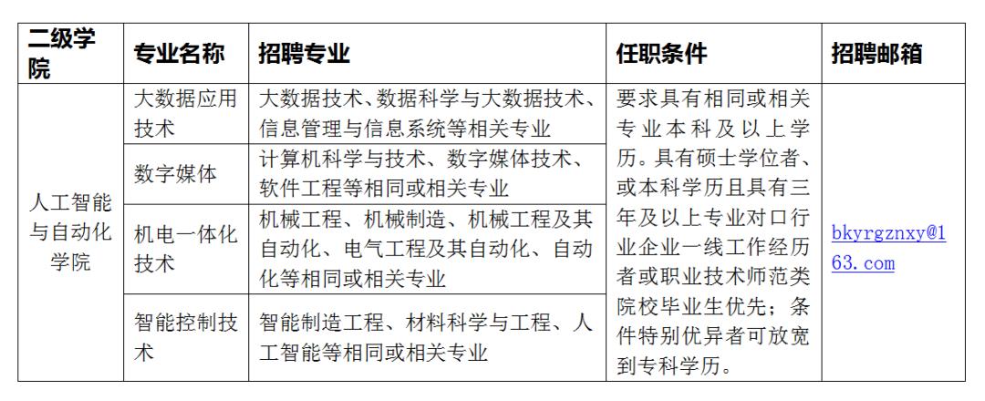 为满足学院教育事业发展需要,加快构建数量适中、结构合理、“双师结构”、“四类人才”(自有专任教师、外聘教师、行业企业兼职教师、校企合作办学教师)的高素质师资队伍,现面向社会公开招聘专业课教师。