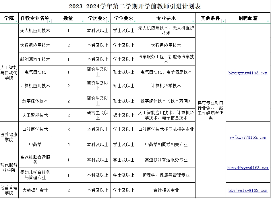 为满足学院教育事业发展需要,加快构建数量适中、结构合理、“双师结构”、“四类人才”(自有专任教师、外聘教师、行业企业兼职教师、校企合作办学教师)的高素质师资队伍,现面向社会公开招聘各专业教师等优秀人才。