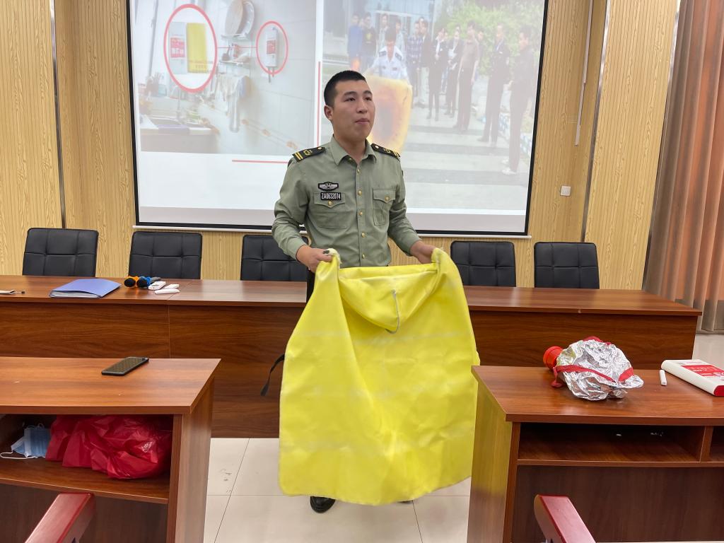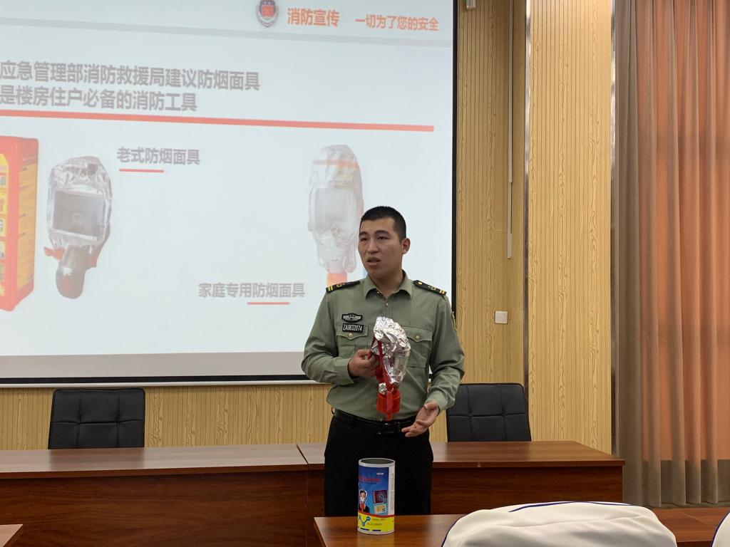 石教官结合近期全国各地发生的多起重大火灾事故,从火灾的危害、火灾的分类、防烟面具、灭火毯、常用的灭火方法等几方面进行了讲解。在讲解过程中通过亲自示范让大家切实体会具备基本消防安全知识的重要性。