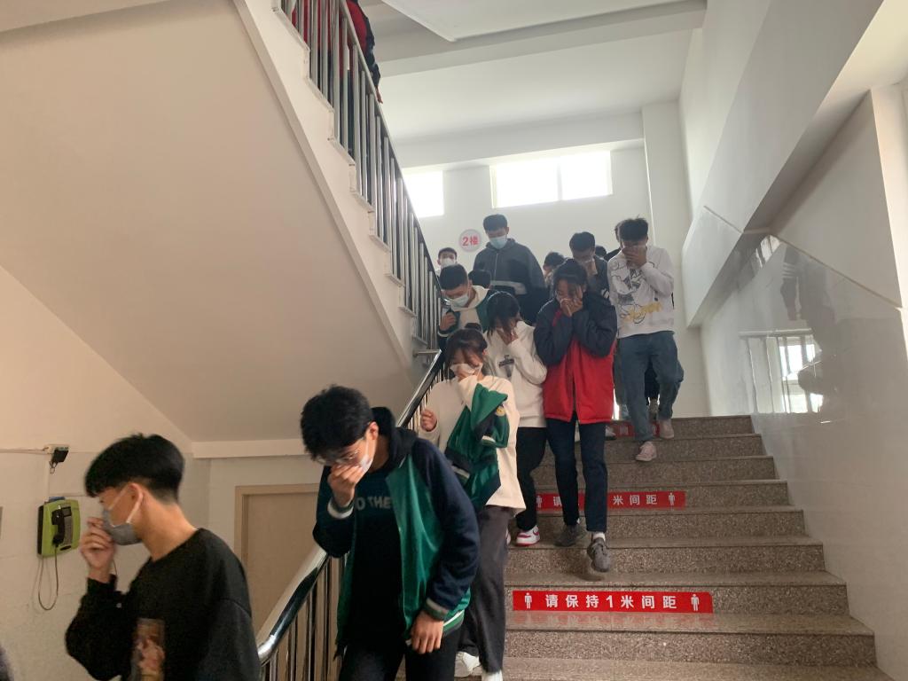 警报声响,全员迅速进行消防紧急疏散演练状态。在现场工作人员的指挥下,全体学生用湿毛巾、衣物等捂住口鼻,按照预定的逃生路线,弯腰低头有序撤离教室,到达指定位置。