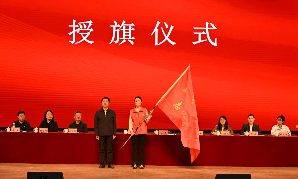 张杰为滨州市人民医院“精卫填海”志愿服务队授旗。