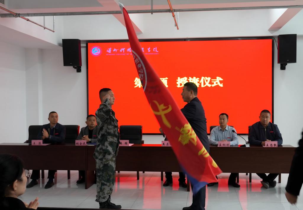 授旗环节,韩锋将“义警队”旗帜授予指导员同志。旗帜飘扬,使命在肩,挥舞的旗帜点燃了全体队员守护校园的昂扬斗志和服务师生的澎湃激情。