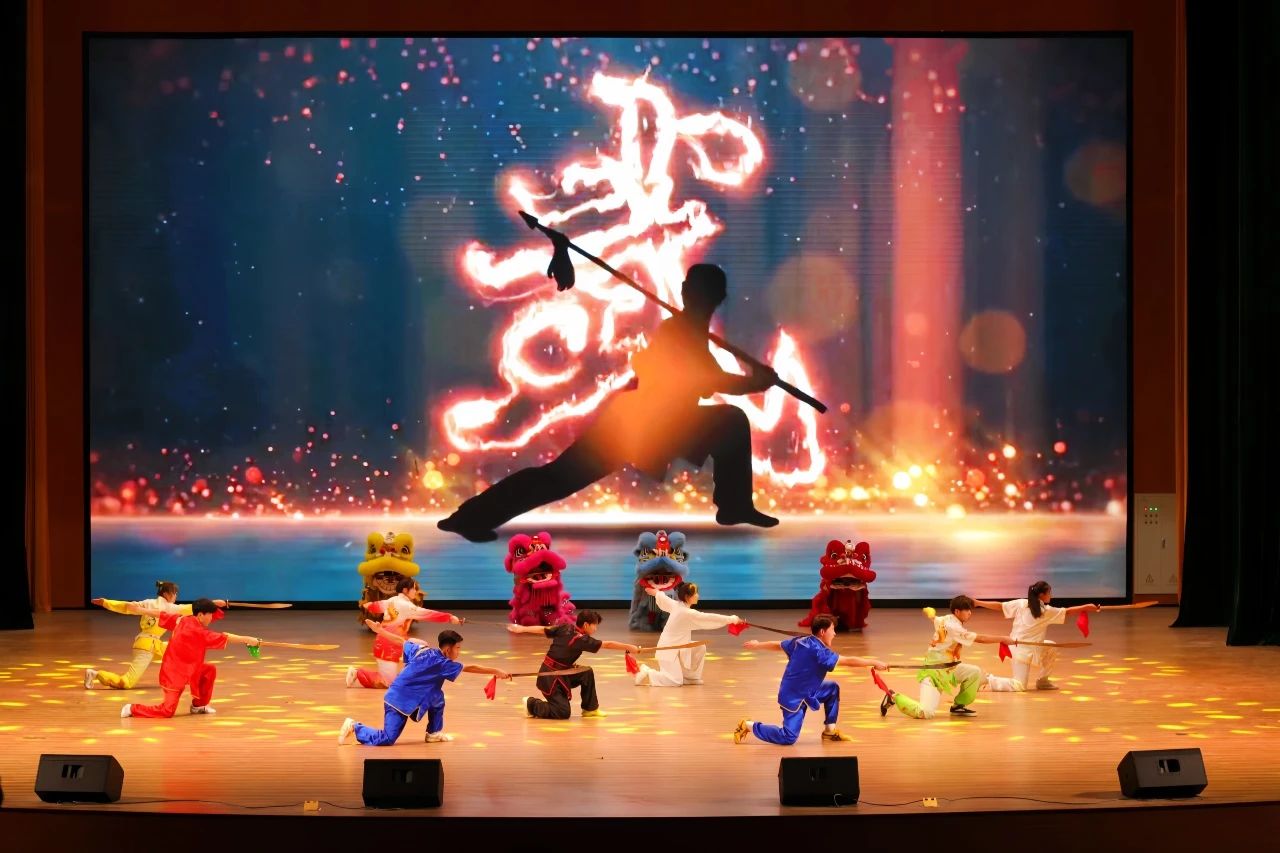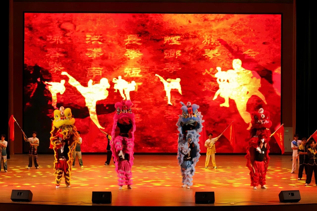 幕布拉开,四只矫健的醒狮霸气登场,表演灵动鲜活,气势非凡。武术表演人员与醒狮舞者配合默契,拳风呼啸间,醒狮灵动跳跃,一招一式,尽展传统风采。这场表演是传承与团结的象征,激励着在场者热情地投入后续活动。