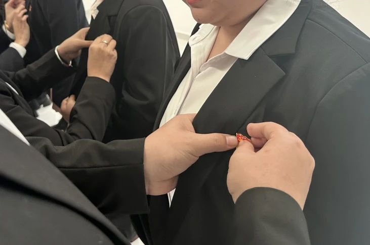 仪式在雄壮的《国际歌》中拉开序幕,全体与会成员全体起立、庄严合唱。曲钰洁宣读了新接收预备党员名单,李会军及各支部书记为他们佩戴党徽。