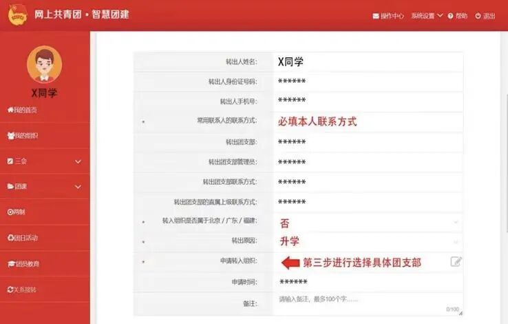 5.选定“申请转入组织(具体团支部)”后,转入团组织管理员、转入团组织联系方式为系统自动填入,请按要求写好备注内容,备注具体格式: