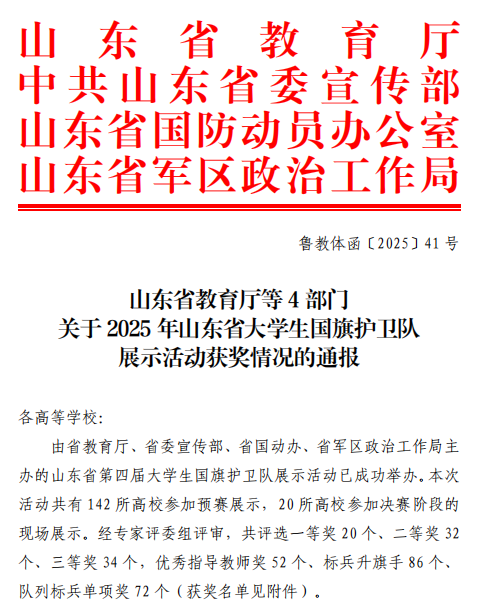 近日,山东省教育厅、中共山东省委宣传部、山东省国防动员办公室等4部门联合印发通报,公布2025年山东省第四届大学生国旗护卫队展示活动获奖情况。