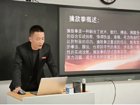 一声令下,气势如虹!张洋洋老师的课堂从安静的课室转移到了充满活力的训练场。他不仅一招一式地传授“擒敌拳”的格斗技巧,更将防卫意识、战术思维和坚韧不拔的意志品质融入教学之中,展现了文武兼备、刚柔并济的独特教学魅力。