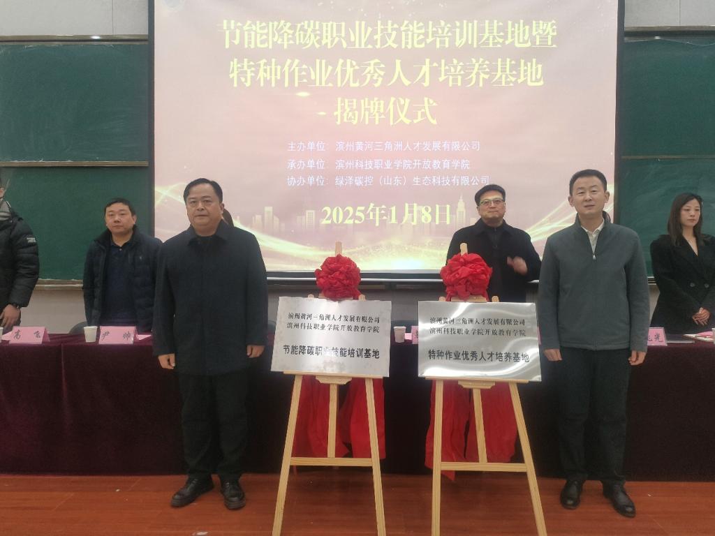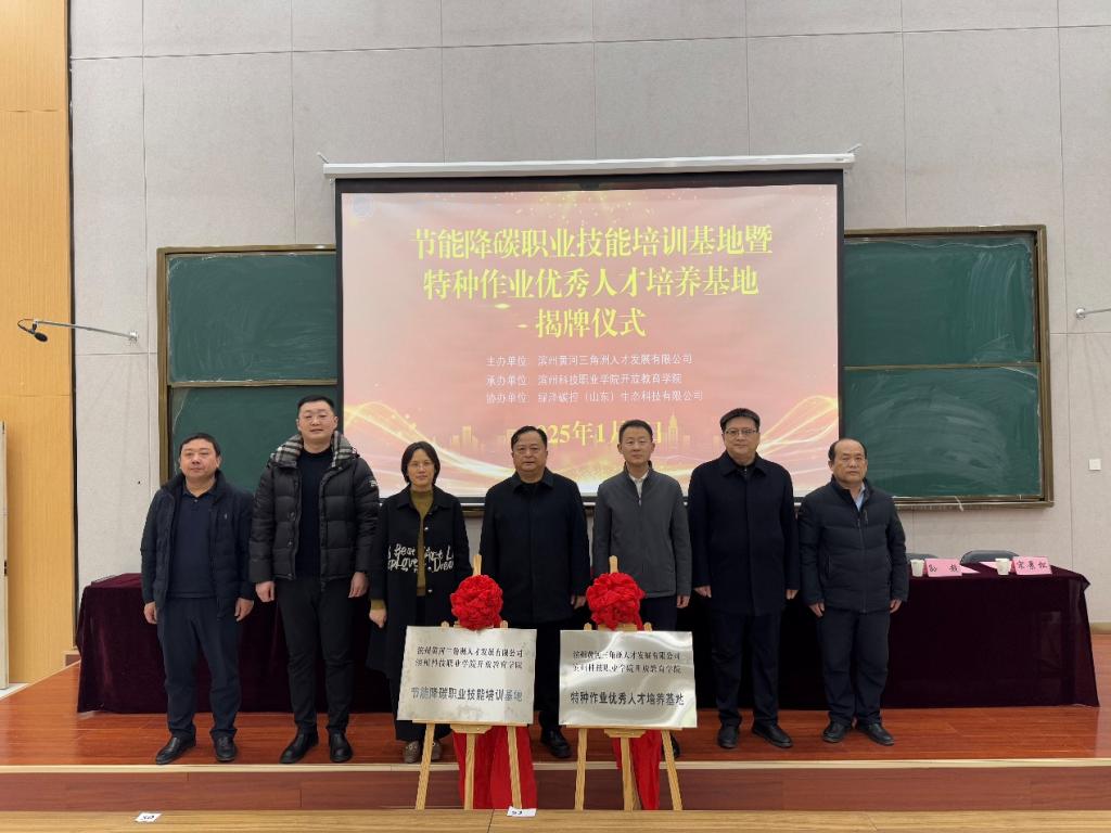 1月8日,beat365在线唯一官网与滨州市黄河三角洲人才发展有限公司举行节能降碳职业技能培训基地暨特种作业优秀人才培养基地揭牌仪式。滨州市财金集团党委委员、副总经理慕术鹏,滨州市财金集团人力资源部部长、滨州人才发展集团总经理窦小梅,滨州人才发展集团副总经理尹帅,滨州人才发展集团综合部副部长孙超,绿泽碳控(山东)生态科技有限公司总经理高飞,绿泽碳控(山东)生态科技有限公司环保部经理宋景松一行来beat365参加揭牌仪式,beat365在线唯一官网党委委员、副校长刘曙明,党委委员、开放教育学院院长王军出席揭牌仪式,活动由开放教育学院副院长朱兆光主持。