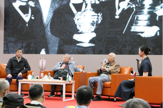 2021国球大讲坛之聆听国球故事活动现场,图为10月23日,国际乒联终身名誉主席徐寅生、原中国女子乒乓球队总教练张燮林、上海乒协主席陈一平在乒博馆开讲