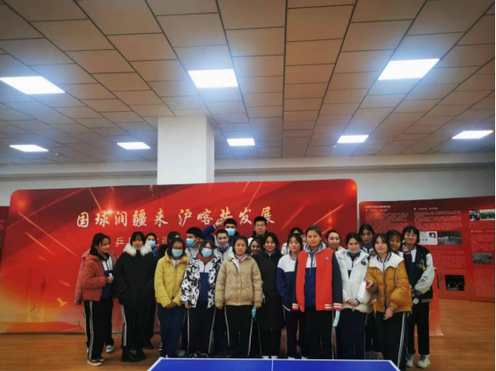 “沪喀联动 国球润疆”2021年全国乒乓文化巡临展走进新疆喀什巴楚县和泽普县,图为2021年12月2日,新疆喀什巴楚县第二中学学生参观展厅后合影留念