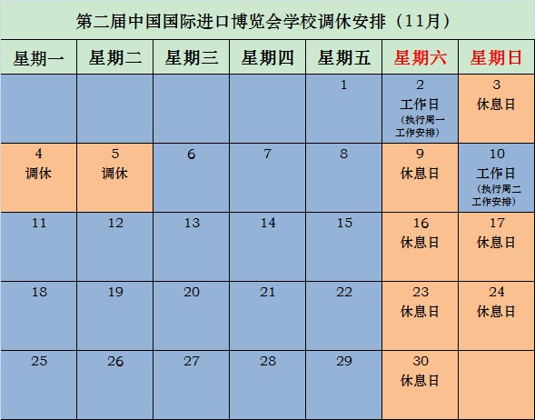 根据《关于调整第二届中国国际进口博览会期间公众休息日安排的通知》(沪府办[2019]113号)、《上海市教育委员会关于第二届中国国际进口博览会期间本市教育系统学校调整休息日安排的通知》(沪教委办〔2019〕50号)的要求,结合学校工作实际,现就第二届中国国际进口博览会期间我校调休作如下安排。