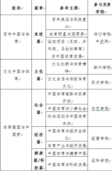 广泛学习其他高校已经打造的“中国系列”课程的价值理念、构建思路,紧密围绕“中国梦·体育梦”,以“体育强国·健康中国”发展方略为导向,全力打造适合我校办学传统、专业优势的课程体系。在全面育人的方针指引下,根据我校培养卓越体育人才的办学定位,发挥依托体育行业发展的优势,量身定做,提供更适合我校特点的课程菜单。课程内容主要围绕三个板块六个篇章展开,三个板块:一是百年中国与体育,二是文化中国与体育,三是体育强国与中国梦。六个篇章为竞技篇、文化篇、社会篇、经济篇、健康篇、科技篇。每一个篇章下设计几个相近又各有侧重的专题,把“四个自信”有机地融入在教学内容中,既聚焦体育领域内的热点,又实现思想政治教育的落地。(详见附表)