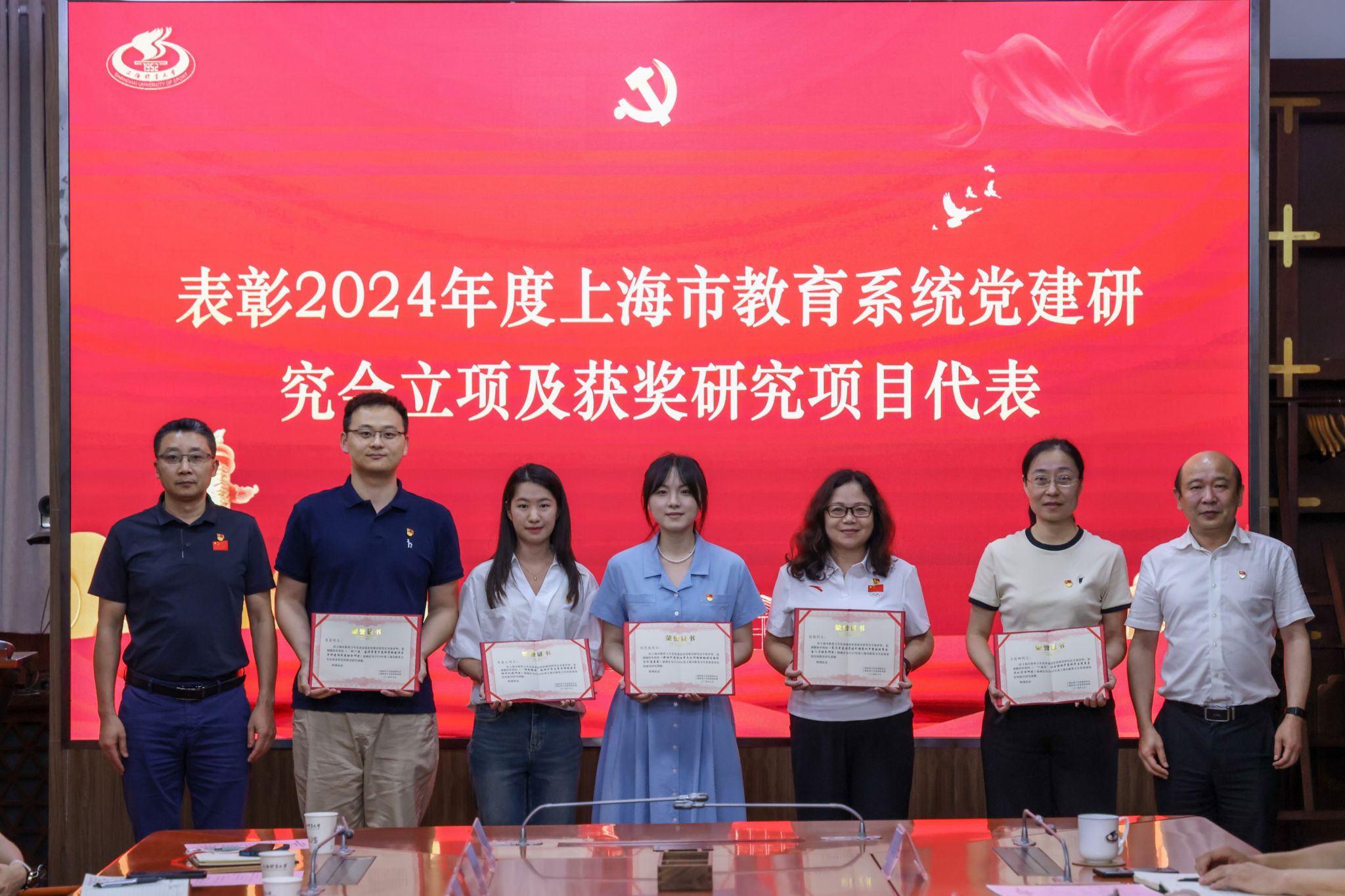 党委副书记王继红,党委副书记、纪委书记崔勇和副校长唐炎为获得2024年度上海市教育系统党建研究会立项及获奖研究项目颁发证书。
